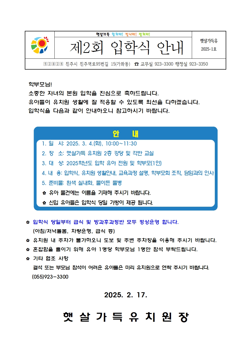 햇살가득유치원 제2회 입학식 안내