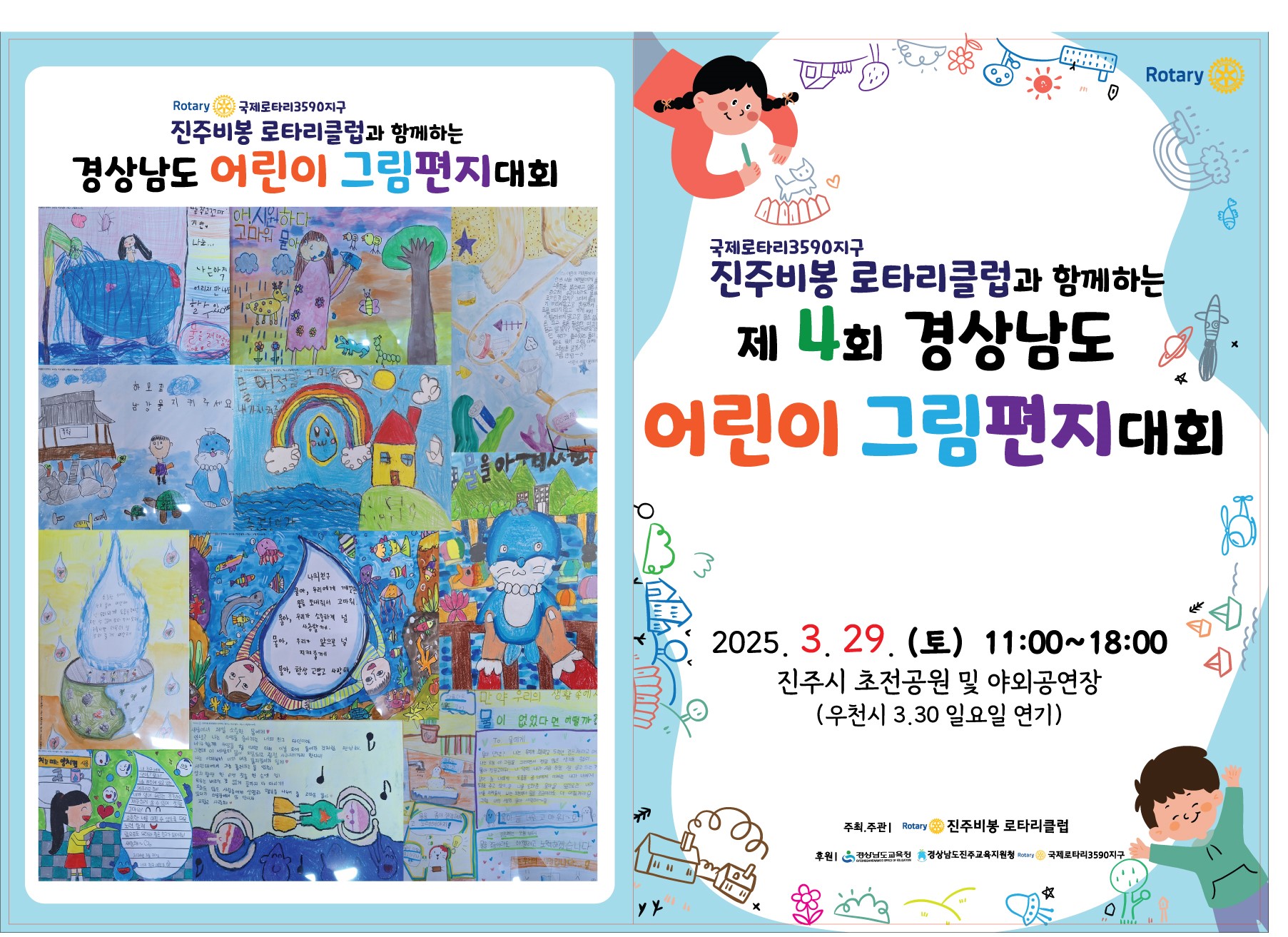 제4회 경상남도 어린이 그림편지 대회를 개최하오니 참여할 어린이는 2025년 3월28일(금) 18:00까지온라인 접수해 주시기 바랍니다.(당일 접수 12:30분까지) ◇ ◆ ◇아 래◇ ◆ ◇ ○ 대 회 명 : 제4회 경상남도 어린이 그림편지대회 ○ 대회일시 : 2025년 3월 29일(토) 11:00~18:00 ○ 참여대상 : 유치부 및 초등학교 학생 ○ 대회내용 : 어린이 그림편지대회 및 프리마켓, 체험부스, 공연,입상작 전시회 ○ 장 소 : 초천공원 및 야외 공연장 ○ 시상내역