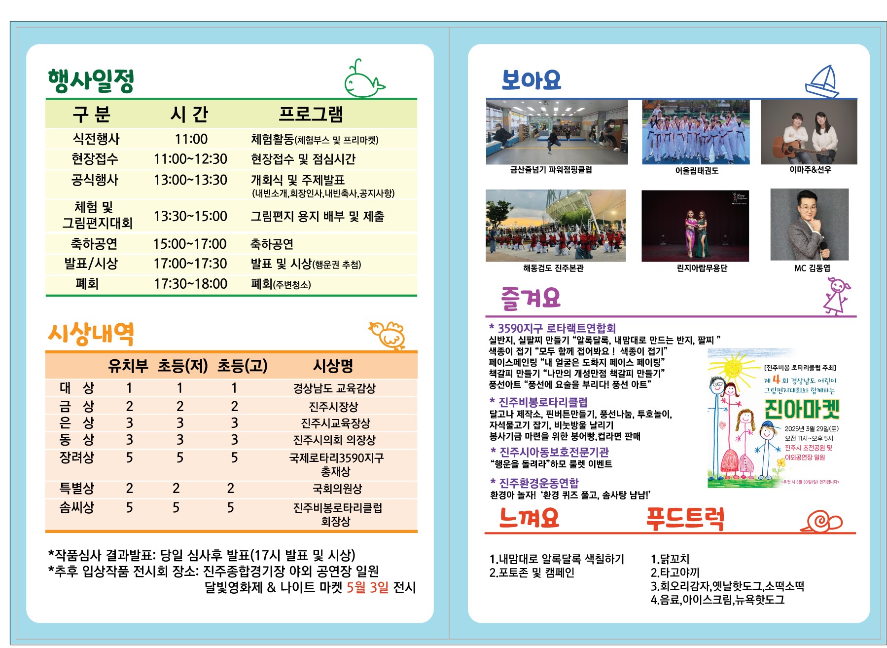 구분 | 시 간 | 내 용 | 식전행사 | 11:00 | 체험 활동 | 현장접수 | 11:00 ~ 12:30 | 현장접수 및 점심시간 | 공식행사 | 13:00 ~ 13:30 | 개회식 및 주제발표 | 체험 및 그림편지대회 | 13:30 ~ 15:00 | 그림편지 용지 배부 및 제출 | 축하공연 및 발표/시상 | 15:00 ~ 17:00 | 축하공연 | 17:00 ~ 17:30 | 발표 및 시상 | 폐회 | 17:30 ~ 18:00 | 폐회 |