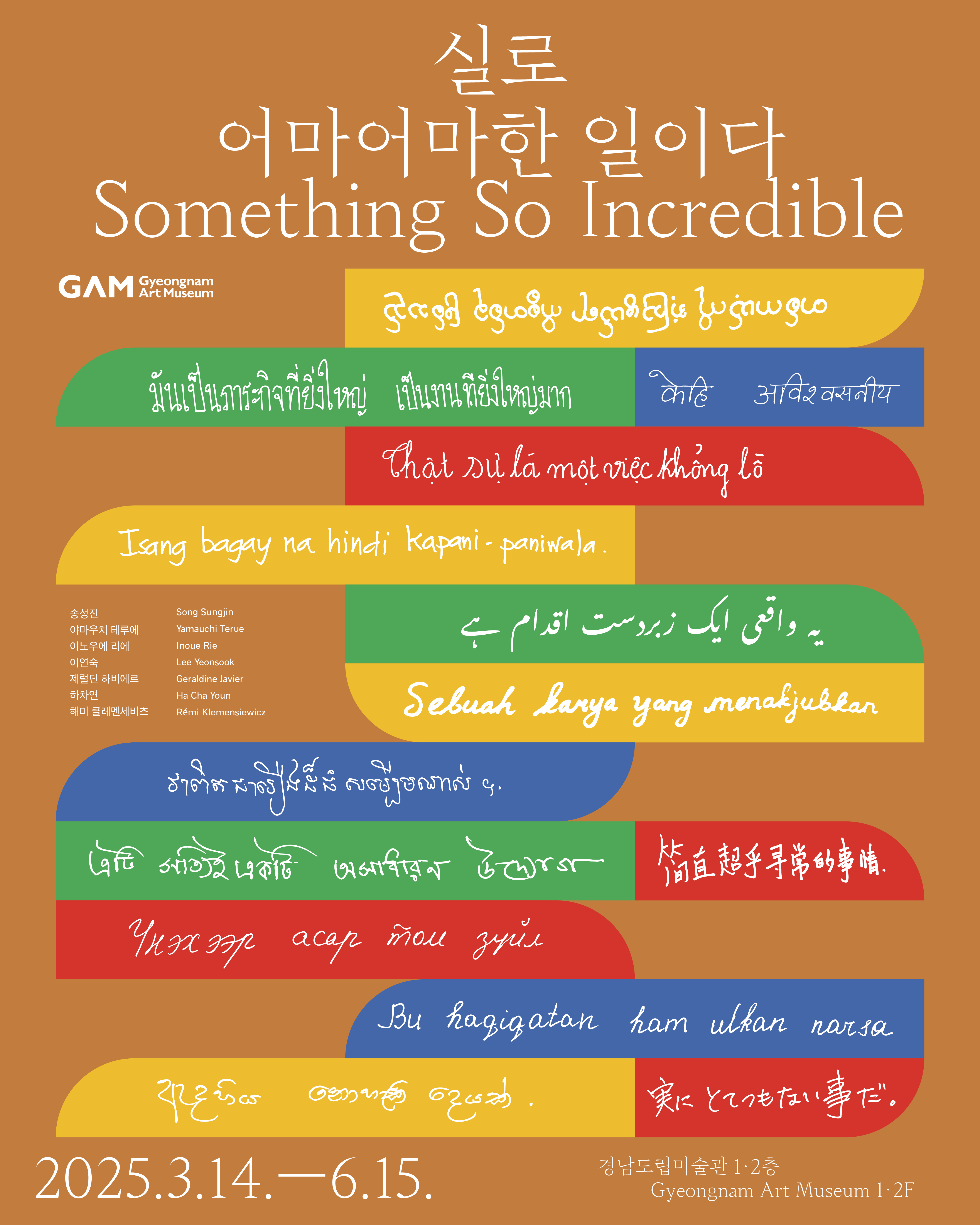 가. 전시개요 1)《실로 어마어마한 일이다》 전시기간 : 2025. 3. 14.(금) ~ 6. 15.(일) 전시장소 : 경남도립미술관 1·2층 전시실 전시내용 : 전시와 작품, 아카이브를 통해 이주를 둘러싼 오늘의 현실을 살펴 보고 그 속에서 우리는 어떤 인식과 태도로 살아가고 있는지, 어떻게 미래를 살아가야 하는지에 대해 고민해 보는 전시 참여작가 : 박생광, 송성진, 야마우치 테루에, 이노우에 리에, 이연숙, 이우환, 제럴딘 하비에르, 하차연, 해미 클레멘세비츠 전시작품 : 회화, 영상, 설치, 사진 등 총 12점 2)《더하고 나누고》 전시기간 : 2025. 3. 14.(금) ~ 6. 15.(일) 전시장소 : 경남도립미술관 3층 전시실 전시내용 : 도립미술관 개관 전부터 20여 년간 수집한 기증작품들을 통해 기증의 의미와 사회적 가치를 생각해보고, 도립미술관 기증의 역사와 더불어 주요 기증 사례별 작품을 선별하여 공유하는 전시 참여작가 : 클라스 스터블스(Klaas Stoppels), 강국진, 권진규, 김경호, 김아타, 김영욱, 김영진, 김인하, 김종원, 김주석, 김진성, 남춘모, 노흥석, 다까하시 마사루, 문신, 박덕규, 박생광, 박영숙, 백성근, 백순공, 성재휴, 심문섭, 안병목, 안창홍, 앙드레 코타보 (Andre Cottavos), 양달석, 유영국, 이 인, 이강소, 이두옥, 이만익 등 47명 전시작품 : 회화, 판화, 사진, 조각 등 총 65여 점 나. 미술관 운영 1) 관람시간 : 10:00~18:00 / 마지막 입장 17:30 / 매달 마지막 수요일 마지막 입장 19:30 2) 휴 관 일 : 매주 월요일(월요일이 공휴일인 경우, 그 다음 첫 번째 평일 휴관), 1월 1일, 설날 3) 관 람 료 : 전시기간 내무료 4) 관람예약 : 단체예약(20명 이상) 홈페이지 사전 예약 (20명 이하 및 개인관람 예약 없이 관람 가능) 5) 전시해설 : 1층 전시 13:00, 15:00 / 3층 전시 14:00, 16:00 6) 전시문의 : 055-254-4600 ※ 자세한 사항은 경남도립미술관 홈페이지(https://www.gyeongnam.go.kr/gam) 참조 |